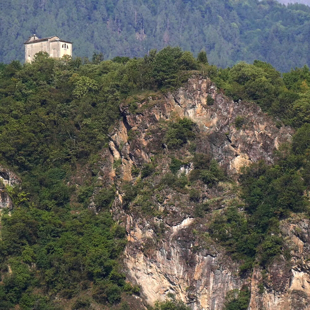 La rupe del Calvario è una suggestiva prominenza rocciosa che aggetta sul fondovalle, costituita da scisti cloritici del Servino.